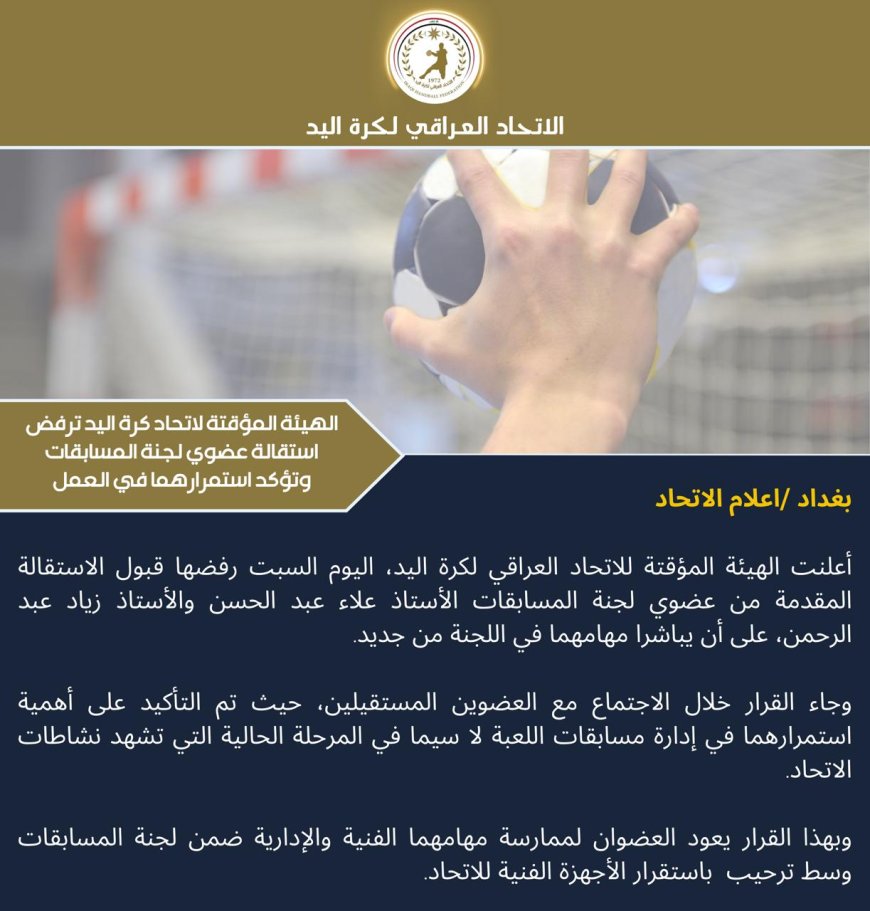 أعلنت الهيئة المؤقتة للاتحاد العراقي لكرة اليد، اليوم السبت، رفضها قبول الاستقالة المُقدَّمة من الأستاذ علاء عبد الحسن (رئيس لجنة المسابقات) و الأستاذ زياد عبد الرحمن (عضو لجنة المسابقات)
